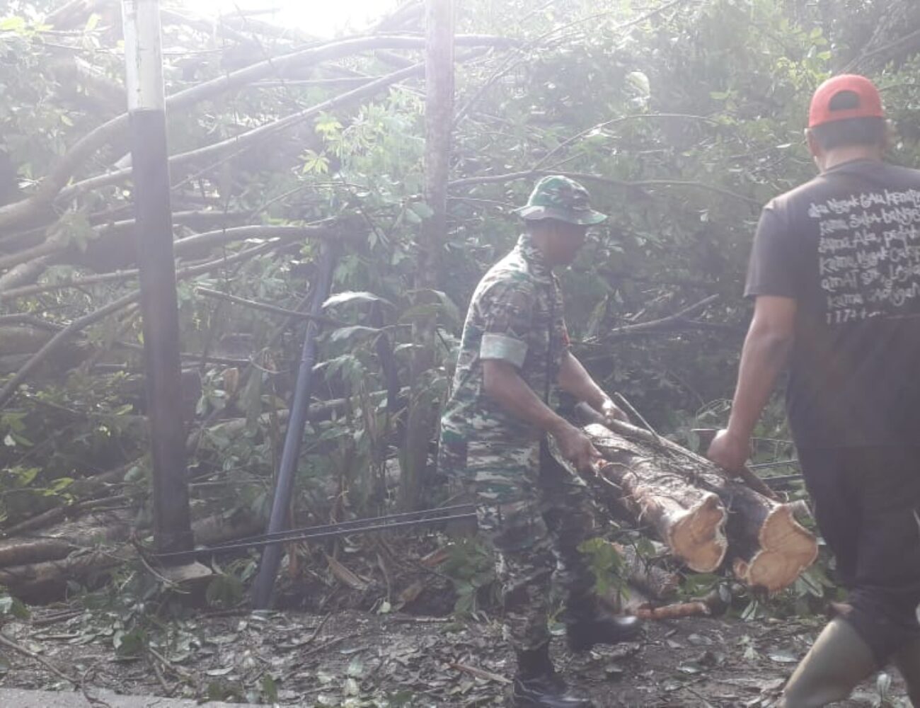 Babinsa Bersama Dinas Sektoral Desa Bodang dan Warga Bersihkan Pohon Tumbang Akibat Angin Kencang
