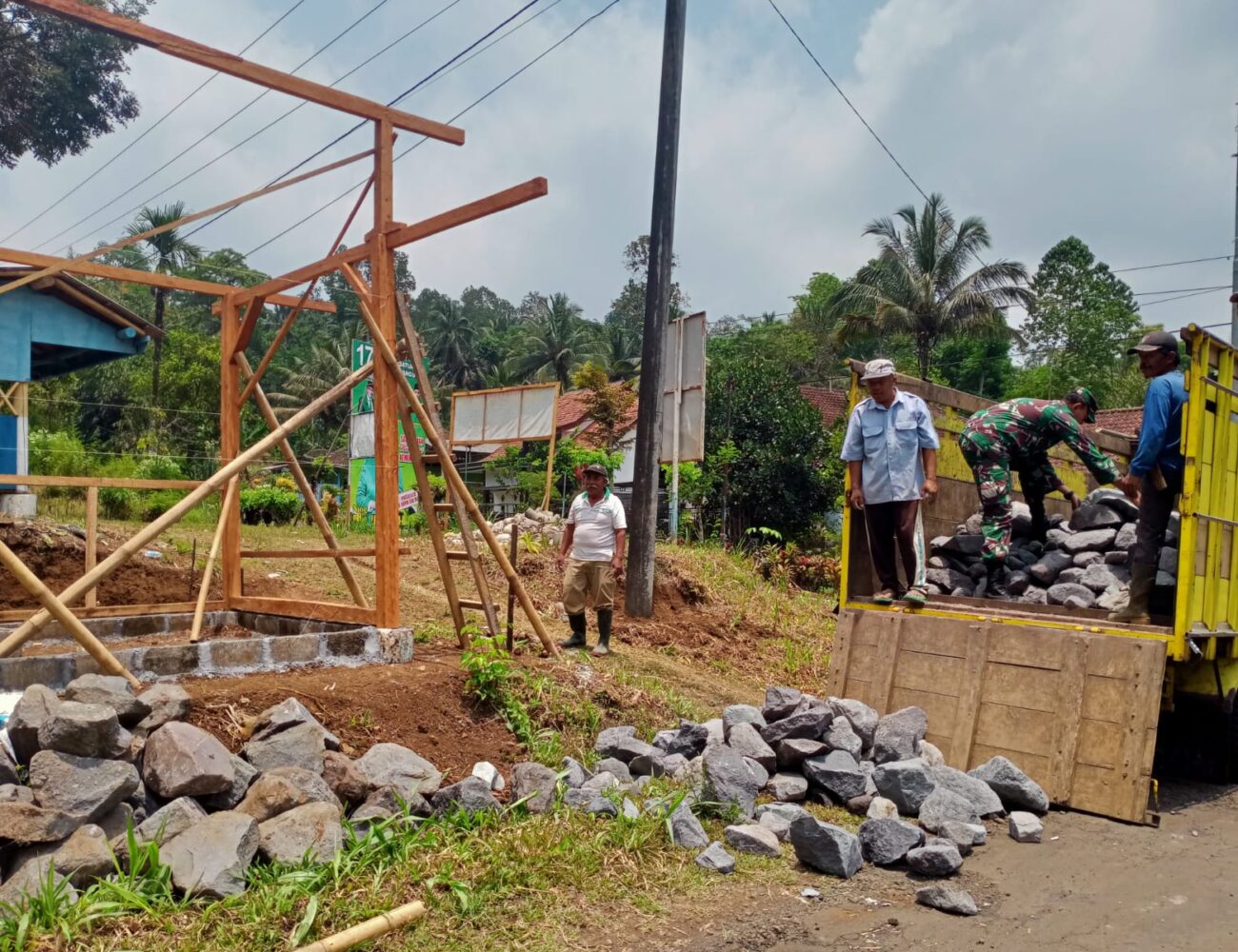 Wujud Kepedulian, Babinsa Gucialit Bantu Warga Angkat Batu Buat Gudang Pupuk Pawon Urip