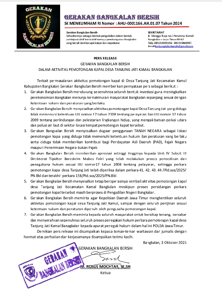 Harianmerdekapost.com, Bangkalan-Jatim,- Hari Jumat , 03 Oktober 2025. LSM Gerakan Bangkalan Bersih (GBB), secara resmi mengeluarkan surat pers rilis yang di tanda tangani langsung oleh ketua LSM GBB. Surat pers rilis tersebut berkaitan dengan aktivitas pemotongan kapal yang beroperasi di wilayah Desa Tanjung Jati, Kecamatan Kamal, Kabupaten Bangkalan.