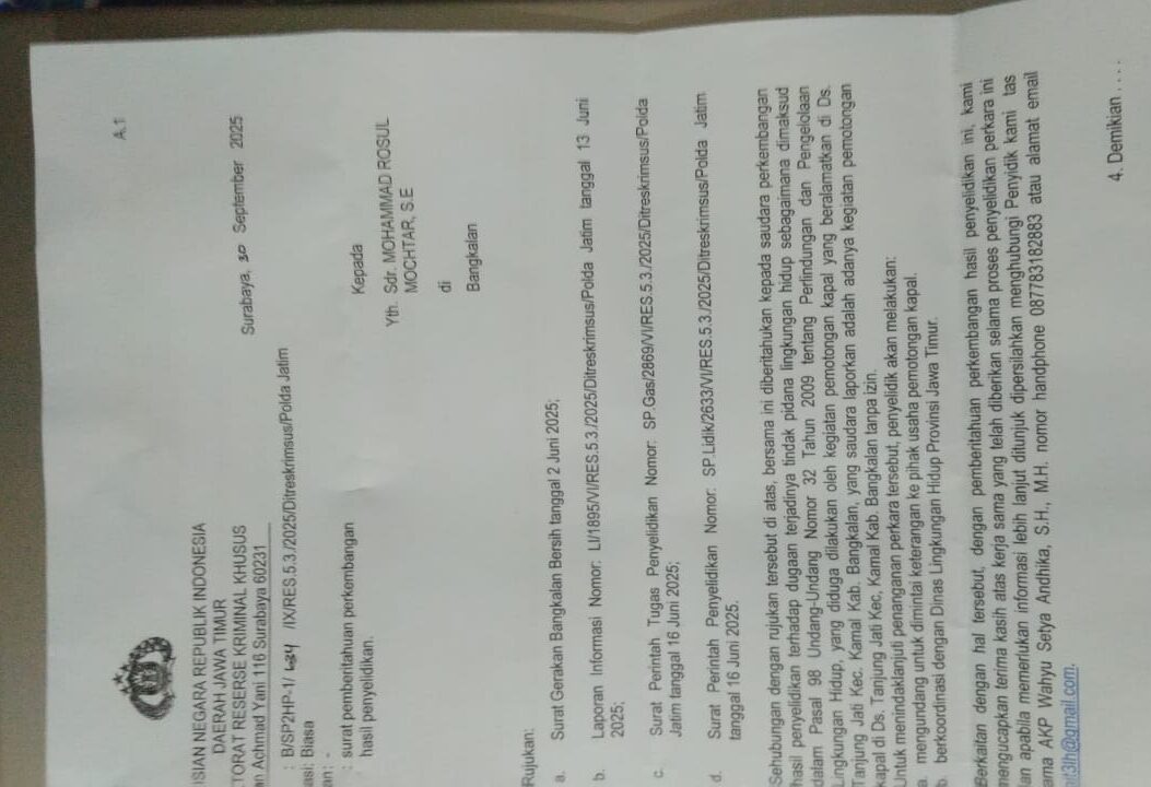 Termasuk perkara 41, 42, 43, 44/Pid.sus/2025/PN.Bkl dan 158/Pid.sus/2025/PN.Bkl. Namun, LSM GBB juga mendesak agar Polda Jawa Timur segera menindak tegas untuk menghentikan seluruh aktivitas pemotongan kapal di Desa Tanjung Jati, sampai dengan pihak yang bersangkutan memenuhi legalitas perijinan sesuai dengan prosedur dan undang undang yang berlaku.