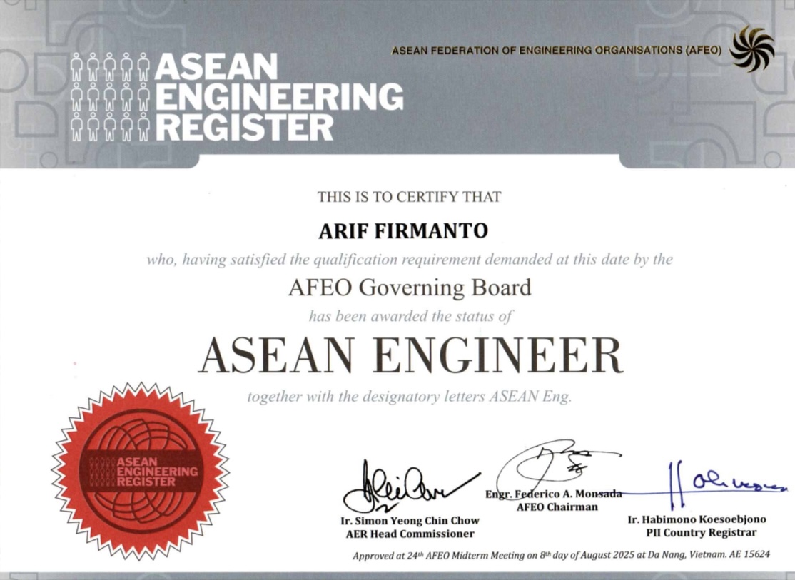Dengan penetapan ini, Dr. Arif kini resmi tergabung dalam jajaran insinyur profesional berskala regional, sebagaimana tertuang dalam sertifikat resmi yang ditandatangani oleh seluruh jajaran pengurus AFEO.