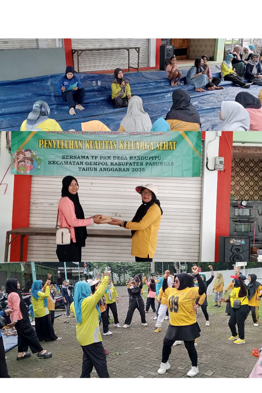 Berkait dengan perihal tersebut diatas pada hari minggu tanggal ( 21-12-2025) bertepatan dengan peringatan Hari Ibu, TP PKK desa Randupitu kecamatan Gempol kabupaten Pasuruan Gebyar Senam Sehat , Penyuluhan Kualitas Keluarga Sehat, Pemeriksaan mata gratis dan Pemberian PMT Seimbang yang diikuti oleh semua kader kesehatan se desa Randupitu ( RDS. Balita, Remaja dan Lansia).