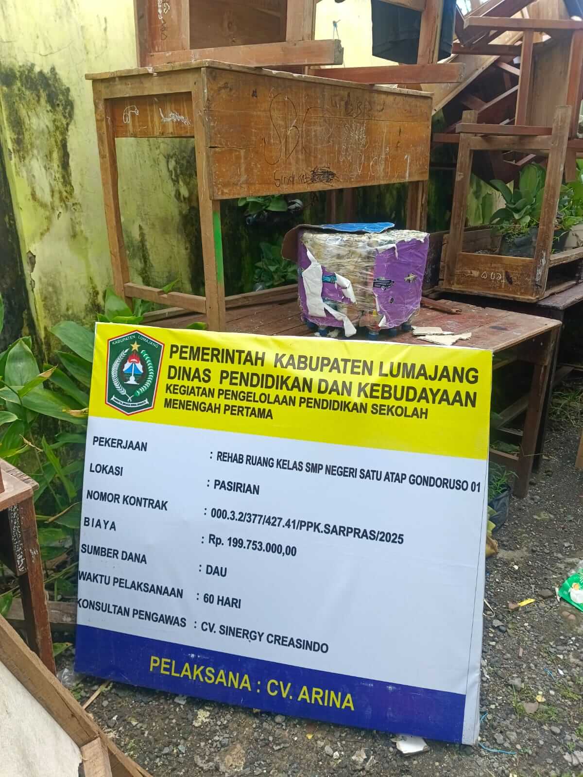 Seperti halnya Pelaksaan Rehabilitasi ruang kelas SMP Negeri Satu Atap Gondoruso kecamatan Pasirian yang di kerjakan oleh CV Arina jalan Juanda no 11 Rogotrunan lumajang dengan anggraran Rp 199 753 000, sumber anggran Dana Alokasi Umum ( DAU) tahun anggaran 2025 dengan waktu pelaksanaan 60 hari sumber anggaran dari APBD oleh Dinas Pendidikan dan kebudayaan kabupaten lumajang yang di kerjakan oleh orang lain yang tidak ada kaitannya dengan Surat Perintah Kerja ( SPK).