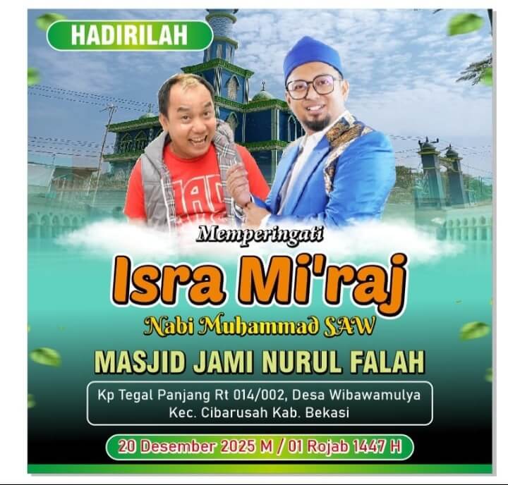 Bertempat di masjid Nurul Falah, Kampung Tegal Panjang, RT/RW 004/002, Desa Wibawa Mulya, Kecamatan Cibarusah, Kabupaten Bekasi. Acara Isra Mi’raj ini di adakan oleh masyarakat Kampung Tegal Panjang dan di hadiri oleh berbagai elemen masyarakat termasuk Kades orang nomer satu di Pemerintahan Desa Wibawa Mulya H.Firman Ruli Zaelani SH, para tokoh agama, tokoh masyarakat, tokoh pemuda dan jamaah masjid Nurul Falah, (Sabtu, 20/12/2025).