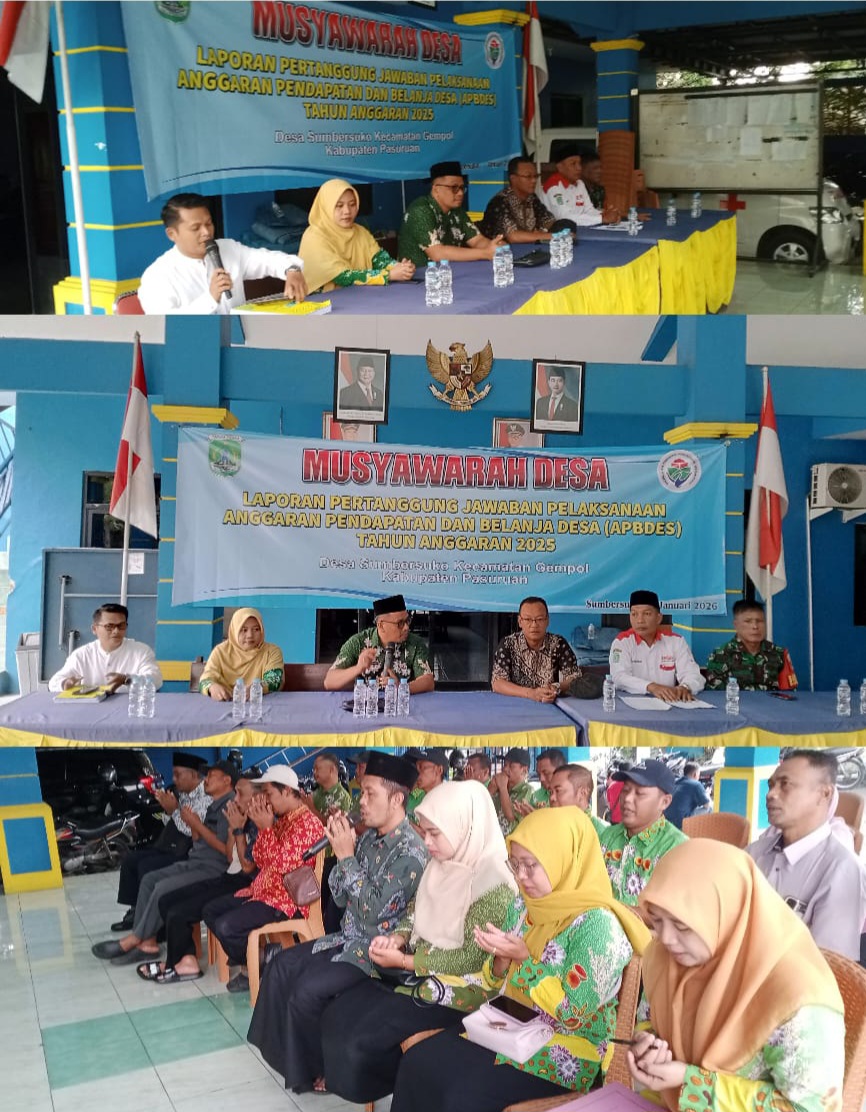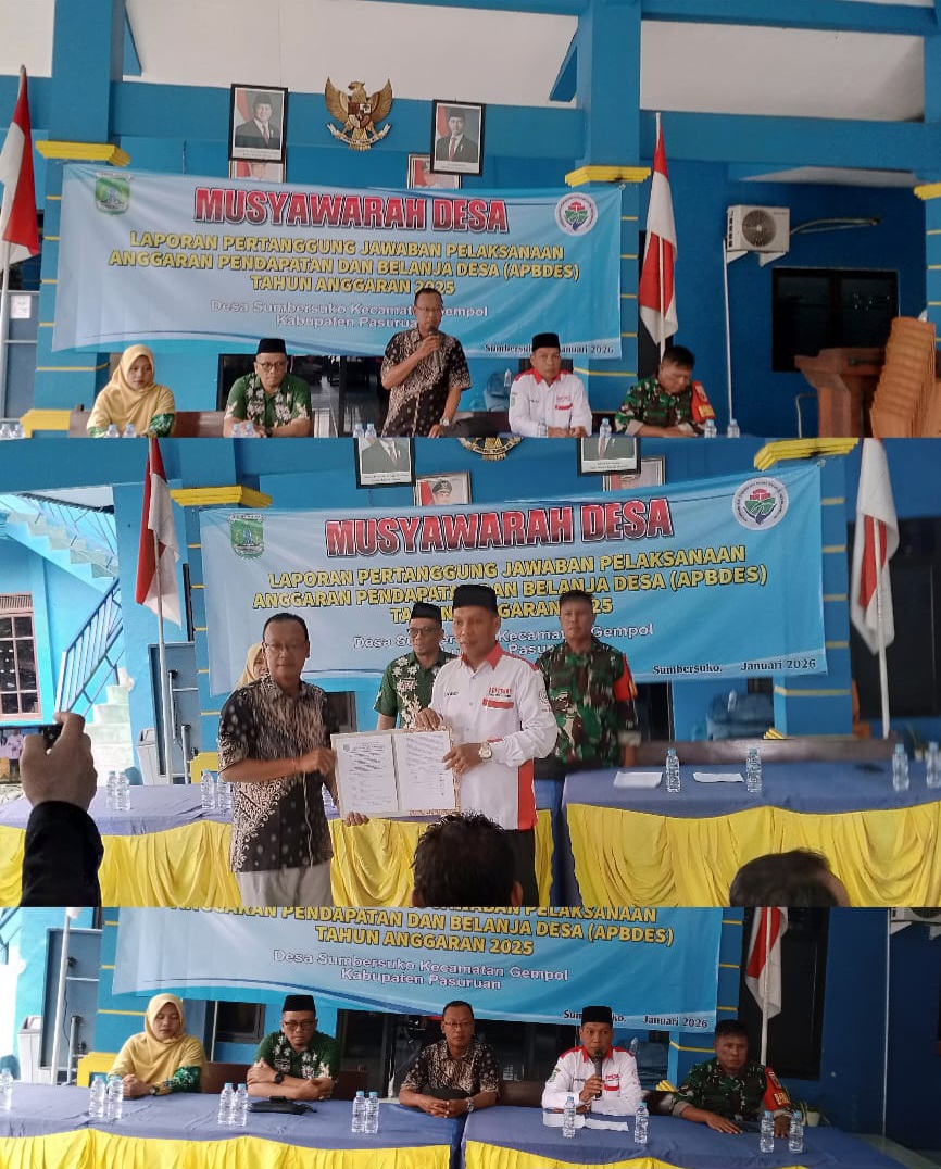 Harianmerdekapost.com, Pasuruan, Jatim – Pada hari kamis tanggal (15-01-2026) Pemdes Sumber Suko kecamatan Gempol kabupaten Pasuruan Gelar Musdes tentang LPJ tahun 2025. Giat tersebut dilaksanakan di pendopo kantor desa Sumber Suko dan dimulai jam 09.00 wib – selesai.