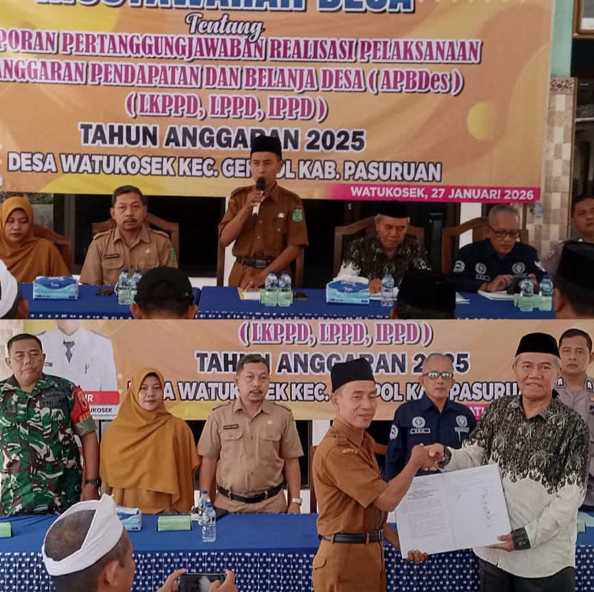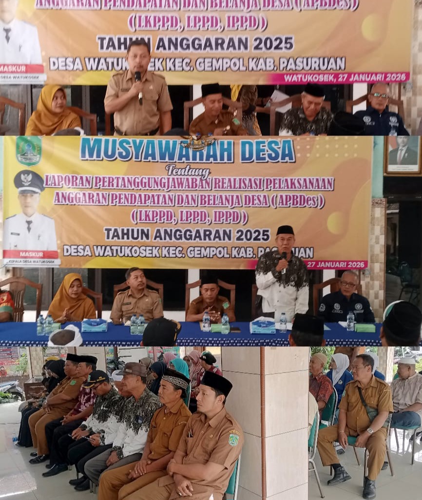 Berkait dengan perihal tersebut diatas Pemdes Watukosek kecamatan Gempol kabupaten Pasuruan pada hari Selasa tanggal (27-01-2026) Gelar Musdes tentang LPJ APBDes ( LKPPD, LPPD,IPPD) tahun 2025.