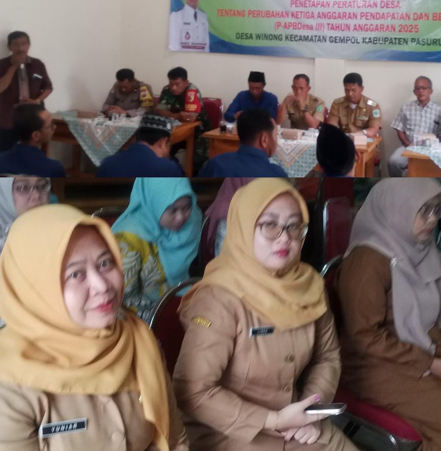 Sedang para pihak yang hadir pada acara tersebut antara lain , camat Gempol diwakili kasi PM kecamatan Gempol , staf PM , kordinator pendamping desa kecamatan Gempol dan lokal desa, kepala desa Winong beserta perangkat ,ketua BPD beserta anggota, Bhabinkamtibmas dan Babinsa, ketua LPM beserta anggota , Ketua TP PKK beserta kader. Perwakilan dari lembaga pendidikan dan kesehatan , Tokoh masyarakat dan Agama.
