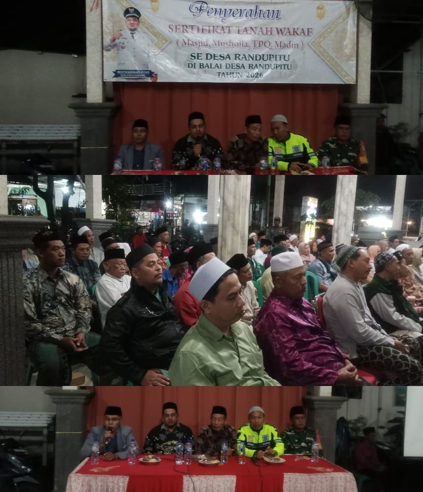 Maka Pemdes Randupitu kecamatan Gempol kabupaten Pasuruan pada hari senen tanggal (26-01-2026) Gelar giat mulia penyerahan sertifikat wakaf Masjid. Musholla ,TPQ dan Madin yang dilaksanakan di pendopo kantor desa Randupitu dan dimulai jam 18.30 wib – selesai.