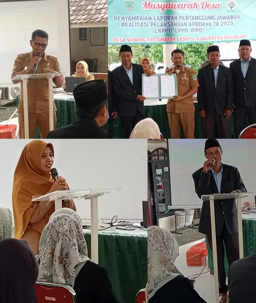 Perihal tersebut diatas dibuktikan pada hari Selasa tanggal(10-02-2026) Pemdes Winong kecamatan Gempol kabupaten Pasuruan menyelenggarakan Musdes tentang LKPJ – APBDes tahun 2025 , yang dilaksanakan di pendopo kantor desa Winong dan dimulai jam 09.30 wib – selesai.