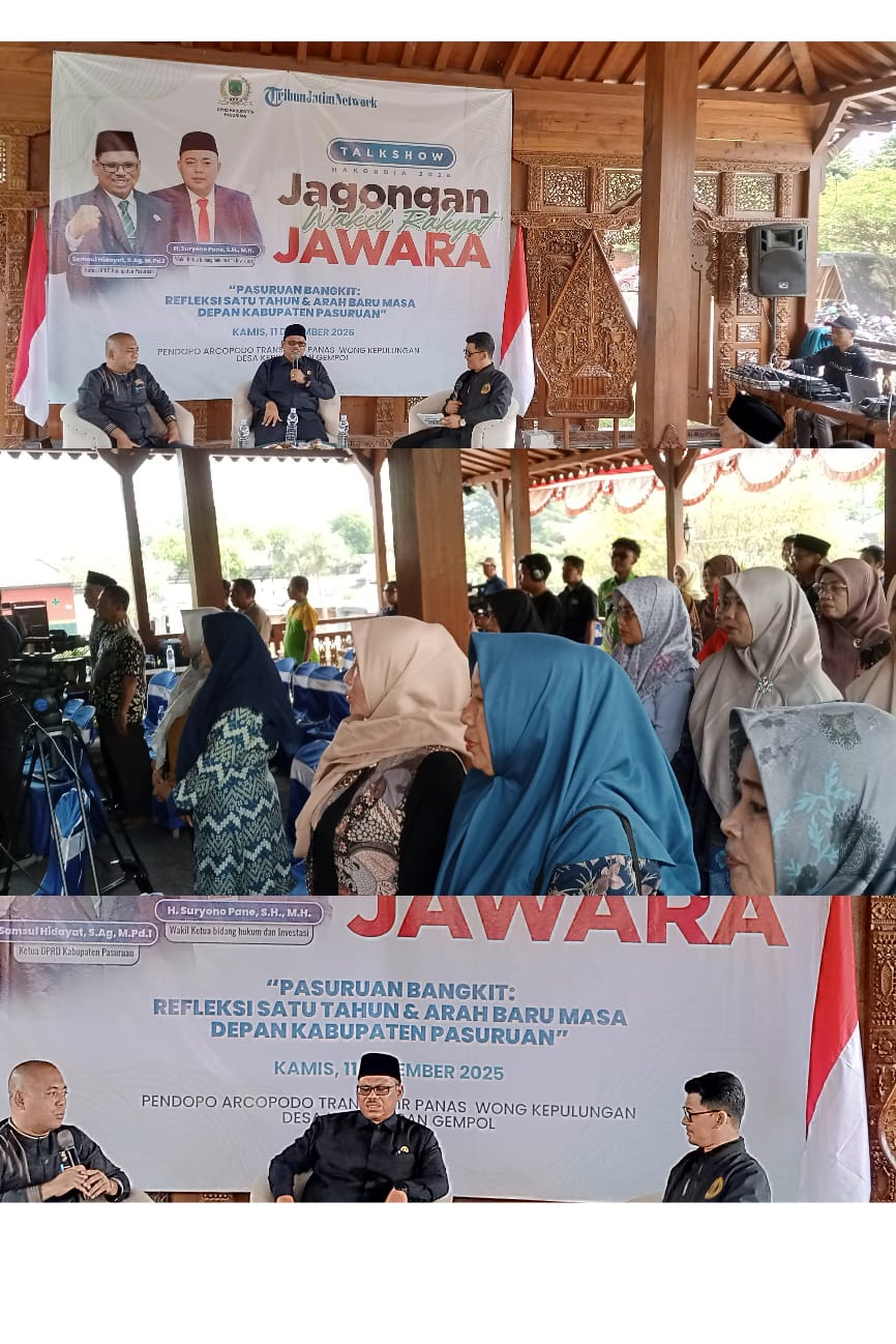 Harianmerdekapost.com, Pasuruan, Jatim – Dalam rangka untuk turut serta berperan dalam mewujudkan Menjemput Perubahan Pasuruan Yang Lebih Maslahat Secara Lahiriyah Bathiniyah , maka pada hari kamis tanggal ( 11 – 12 – 2025) PT JANTRA SURYA MEDIA Gebyar Talkshow JAWARA ( Jagongan Wakil Rakyat) yang bertajuk ” Pasuruan Bangkit : Refleksi Satu Tahun Dan Arah Baru Masa Depan Kabupaten Pasuruan ” Bersama narasumber ketua DPRD kabupaten Pasuruan Bapak Samsul Hidayat ,S.Ag, M. Pd.I dan Perwakilan Tim Pengarah Percepatan Pembangunan Daerah Bapak Suryono Pane SH yang dipandu oleh Moderator kondang Bung Rendy dan MC Mbak Sindi.